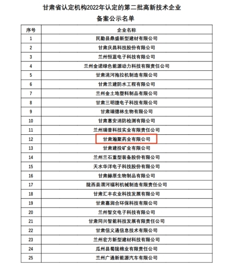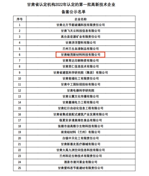 10月18日,科技部火炬中心發(fā)布了“關(guān)于對甘肅省認(rèn)定機(jī)構(gòu)2022年認(rèn)定的第一批、第二批高新技術(shù)企業(yè)進(jìn)行備案公示的通知”,其中專精特新化工產(chǎn)業(yè)孵化器內(nèi)的甘肅峻茂新材料科技有限公司和甘肅瀚聚藥業(yè)有限公司2家入駐企業(yè)被成功認(rèn)定為2022年高新技術(shù)企業(yè)。